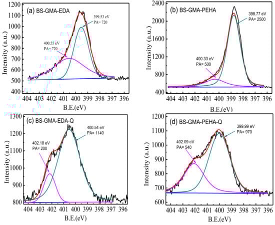 XPS analysis was used to provide the element’s chemical state on the adsorbent. Figure 6 shows the high-resolution N1s spectra of BS based adsorbents. The N1s spectra of BS-GMA-EDA were curve-fitted into two peaks located at 399.53 eV and 400.55 eV. N1s spectra of are BS-GMA-PEHA located at 398.77 eV and 400.33 eV [32]. After quaternization, the peak at 399.53 of BS-GMA-EDA shifted to 402.18 eV, and the peak at 398.77 eV shifted to 402.09 eV, showing that quaternization was successful [33,34,35].
