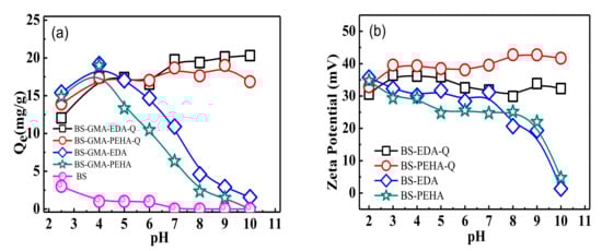 The zeta potential of BS-GMA-EDA and BS-GMA-PEHA explain the pH-dependent adsorption, as shown in Figure 7b. The zeta potential was higher in acidic conditions than those in alkaline conditions. Thus, the positive value in acidic conditions was favorable for phosphate adsorption. To increase the phosphate adsorption performance of the modified BS in a broader pH range, BS-GMA-EDA and BS-GMA-PEHA were quaternized.