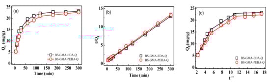 An essential feature of adsorbents is the adsorption kinetics, which allows the measurement of the adsorption rate. Figure 8a shows the phosphate adsorption capacity of the synthesized adsorbents at different contact times. The phosphate adsorption capacities of BS-GMA-EDA-Q and BS-GMA-PEHA-Q increased rapidly with increasing contact time and reached equilibrium at 180 min.