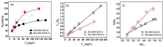 The correlation between the equilibrium adsorption of qe (mg/g) and the equilibrium concentration Ce (mg/L) in the solution is shown in Figure 9a. The adsorption capacity of BS-GMA-EDA-Q and BS-GMA-PEHA-Q increased with the increasing phosphate concentration, and finally reached a constant.