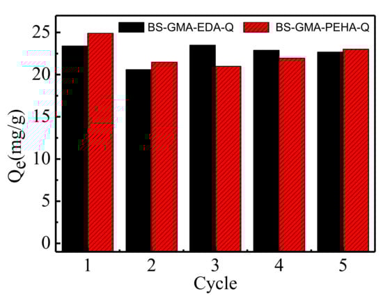 - The repeated use showed that the adsorption performance of the BS-GMA-EDA-Q and BS-GMA-PEHA-Q adsorbents displayed a negligible decrease after five cycles. Therefore, the BS-GMA-EDA-Q and BS-GMA-PEHA-Q adsorbents exhibit good recyclability and can be used repeatedly in practical applications.