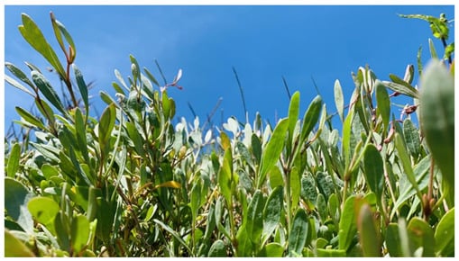 The perennial Halimione portulacoides (L.) Aellen, sea purslane (“gramata branca” or “beldroega do mar” in Portuguese), is a halophyte shrub that belongs to a Chenopodiaceae family and Caryophyllales order. It is found on sandy and muddy coastlines and salt marshes around the coasts of North Africa, Southwest Asia, and Europe [5,6]. In Europe, it is one of the most productive and abundant species in salt marshes. This plant is dispersed along the coast of the Iberian Peninsula, and the prevalence in the Portuguese estuaries is at Tagus and Ria de Aveiro salt marches [7,8,9,10]. With a controversial taxon background, Atriplex portulacoides is also acknowledged as a senior synonym of Halimione portulacoides in the International Plant Names Index [11]. This plant is characterized as a shrub, reaching up to 1.5 m in height (Figure 1). It is a monoecious, protruding-ascending species, with a silvery-gray color and with stems that are often radiant. The leaves are decussate, speared, hollowed out, whole, and fleshy. The inflorescence features unisexual flowers, and the fruit is sessile [12].