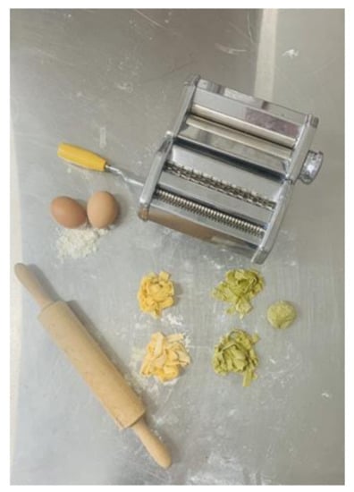 A basic pasta recipe was prepared (control) with the following ingredients: 100 g of wheat flour T65, one egg, and 1.6 g of salt (control). In enriched pasta, the content of salt was replaced by 7.7 g of powdered dried H. portulacoides (equivalent to 1.6 g of salt, assuming that all Na of the dried leaves is linked to NaCl). In both pastas, the ingredients were mixed and kneaded by hand for 15 min and left to rest in the cold, at approximately 4 °C, for 30 min. Then, the paste was prepared and shaped with a home pasta-shaping machine (Figure 2). The machine was adjusted to produce pasta with 1 mm of thickness.
