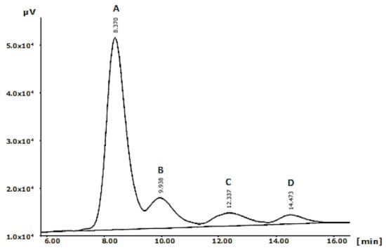 Chromatogram of Halimione portulacoides sugars. A: maltose, B: sucrose, C: glucose, and D: fructose.
