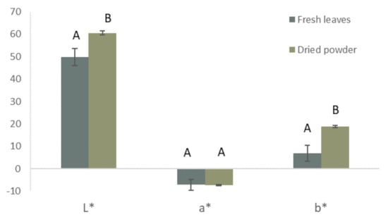 Color parameters of fresh leaves and dried powder of H. portulacoides. Bars with the same letter are not statistically different for each of the color coordinates. The color used for each series in the graph is the estimated real color of sea purslane in the fresh and dried states.