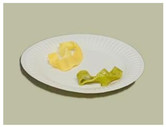 The pasta cooking time was 10 min in boiling water (for 100 g of pasta, 2 L of water was used, to which 6 g of salt was added). Cooking was carried out with precision by respecting the standardized protocol ISO 7304-1:2016 [32] in order to make it possible to compare both samples (control and enriched pasta). After cooking, the pasta was poured into a sieve and drained.
