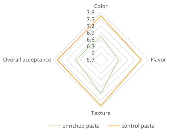 Figure 6 shows the results of the sensory evaluation of four pasta attributes: color, flavor, texture, and overall acceptance; all were expressed in the scale from 1 (dislike extremely) to 9 (like extremely). Among the sensorial parameters, texture showed the best results (7.2 and 7.7, respectively, for enriched pasta and control pasta). The overall acceptance also had results very close to 7.6 for the pasta without H. portulacoides and close to 6.8 for the pasta with H. portulacoides. The attributes of color and flavor had, respectively, scores of 8 and 6.5 for the enriched pasta and around 7.7 and 7.5 for the control pasta. Although the lower scores were obtained for the enriched pasta, its acceptance was reasonable. Statistical analysis showed that the differences between the mean scores for the control and enriched pastas were significant for attributes flavor (p = 0.004) and overall acceptance (p = 0.003), while for the other attributes (color and texture), there were no significant differences (p > 0.05). Figure 6 shows the results of the sensory evaluation of four pasta attributes: color, flavor, texture, and overall acceptance, which are all expressed in the scale from 1 (dislike extremely) to 9 (like extremely). Among the sensorial parameters, texture showed the best results (7.2 and 7.7, respectively, for enriched pasta and control pasta). The overall acceptance also had results very close to 7.6 for the pasta without H. portulacoides and close to 6.8 for the pasta with H. portulacoides. The attributes of color and flavor had, respectively, scores of 8 and 6.5 for the enriched pasta and around 7.7 and 7.5 for the control pasta. Although the lower scores were obtained for the enriched pasta, its acceptance was reasonable. Statistical analysis showed that the differences between the mean scores for the control and enriched pastas were significant for attributes flavor (p = 0.004) and overall acceptance (p = 0.003), while for the other attributes (color and texture), there were no significant differences (p > 0.05).