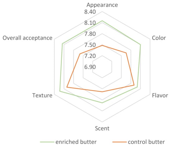Figure 8 presents the results of the sensory evaluation of six parameters: appearance, color, flavor, scent, texture, and overall acceptance to enriched and control butter. It should be noted that the enriched butter had the higher scores in all organoleptic characteristics. Texture had the higher scores for both butters, but the enriched butter presented the highest value. The overall acceptance and appearance of fortified butter also scored with values of 8.15 in both cases, while the values were, respectively, 7.48 and 7.60 for the butter without H. portulacoides. Overall, the tasters preferred the butter with H. portulacoides to the control butter. Statistical analysis revealed that significant differences were found between the control and enriched butter samples only for the mean scores for appearance (p = 0.003), while for all other attributes, the differences were not significant (p > 0.05).