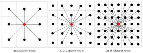 From Figure 1, we find that there are eight directions for the search if we plan a path based on eight adjacent nodes. When the number of adjacent nodes is expanded to 24 and 48, respectively, the search directions are also increased. This means that USVs may have more steering choices when planning a path. The relationship between the number of adjacent nodes, minimum steering angle and search directions is shown in Table 1.
