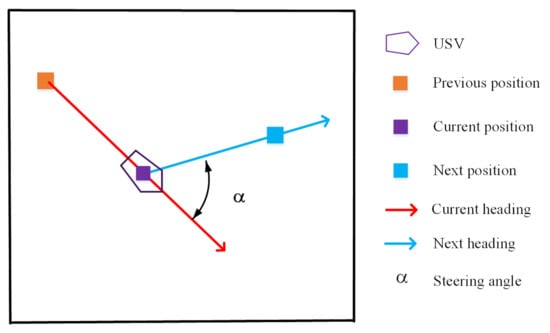 Constrained by the steering maneuverability and the fewer DOF of USVs, the steering angle of USVs is limited. There may be still some sharp turns on the planned path even if we expand to 48 adjacent nodes for path planning. To plan a more realistic path for USVs, the algorithm should consider the steering angle limitation between two adjacent nodes along its path. When a turning angle is larger than the steering angle limitation that the USV can steer each time, we should divide it into several turning operations. Therefore, the steering angle can be constrained within the steering angle limitation. The definitions of USV heading and steering angle are as follows: