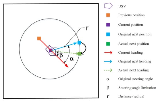 Assume that the coordinate of the current position is (, ). The USV firstly calculates the current heading according to the previous and current positions. Afterwards, the original next position (, ) and original steering angle are calculated. If the original steering angle is larger than the USV’s maximum steering angle (), then we calculate the actual next position (x, y) according to Equation (7). The process is repeated until the USV’s heading is turned towards the original next position.