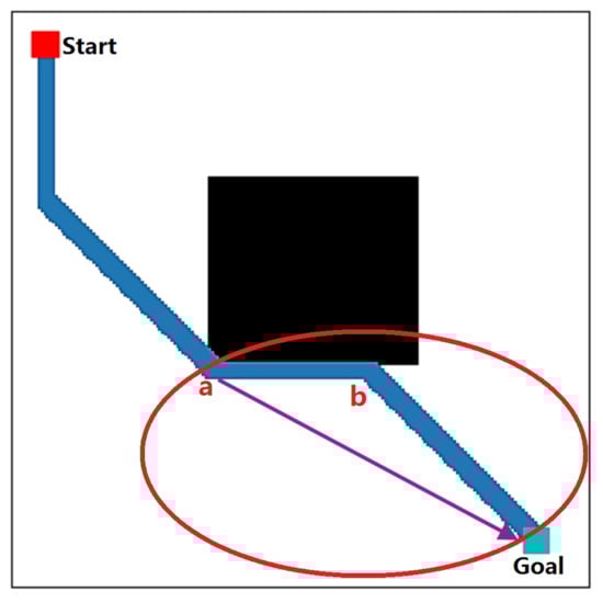 The reversed path planning in D* Lite is beneficial to replanning when there are dynamic obstacles. However, there may also be some redundant turns in the path, which increases the path length. Figure 4 shows a simple path planned by the D* Lite. We find that when D* Lite starts to plan a path from the goal node to the start node, it detects an obstacle at position b and makes a left turn towards position a to avoid the obstacle. Finally, it finds a path from the goal node to the start node. However, we find that the path between position a and the goal node is not optimal. It contains an unnecessary turn towards position b. We can reduce the path if we can let the USV drive straight from position a to the goal node.