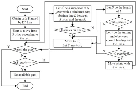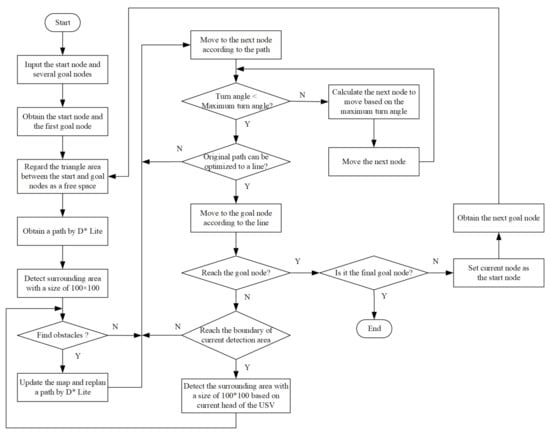 - The USV detects environmental information with its sensors, starting from the current node, and verifies whether the goal node is within the detected area. If so, the USV proceeds to the goal node according to the path planned with D* Lite and the path planning procedure is finished. Otherwise, go to step (3).