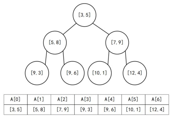 To improve the path search efficiency and decrease the search time, we use the minimum binary heap [30,31] to optimize the priority queue. Figure 6 shows an example of using the minimum binary heap to store data. The node with the smallest key value is on the top of the heap and is stored on the first position of the linear array. All its predecessor nodes have larger key values and are stored on the second and third positions of the array, respectively.