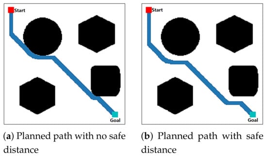 We define an experimental environment on a map with 400 × 400 pixels. The black shapes are obstacles, and the white regions are free space. We set the start node at the upper left of the map and the goal node at the lower right of the map. In addition, we set the safe distance as 10 pixels. We assume that the USV only moves one pixel each time. Figure 8a shows the path planned by the original D* Lite. We find that the planned path is very close to the obstacles. Figure 8b shows a path planned with a safe distance based on Algorithm 1. It shows that there is at least a 10-pixel distance between obstacles and the path. Thus, we improve the safety for the USV to sail through obstacles.