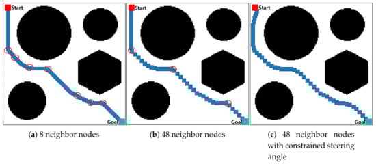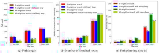 From Figure 14a, we find that when we apply the minimum binary heap to the 8-neighbor and 48-neighbor searches, respectively, on the three maps, their path lengths are the same as in the original neighbor search approaches separately. This is because the minimum binary heap only improves the storage structure of the priority queue, but the search strategy is the same, resulting in the same path length and number of searched nodes. We also find that the path length of 48-neighbor node search is much smaller than that of the eight-neighbor node search. We believe that this is because that the 48-neighbor node search has more choices to select a steering angle for turning, which can lead to a shorter planned path. We also find that when we increase the map size from 500 × 500 to 800 × 800 and 1000 × 1000, respectively, the path length is also increased.