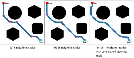 We find from Table 1 that when we increase the number of adjacent nodes from 8 to 24, the search directions are increased from 8 to 16, and the minimum steering angle is significantly decreased from to . This means that the search time is doubled while the minimum steering angle is reduced by two times. When the number of adjacent nodes is increased from 24 to 48, the minimum steering angle is decreased from 22.5 degrees to 11.25 degrees.