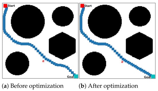Scholars have carried out much research on path planning [3,4,5]. The graph search algorithm of Dijkstra [6] is a classic path planning algorithm based on the breadth-first search strategy. However, the path search efficiency of the Dijkstra algorithm is very low due to its global path search strategy. The RRT* algorithm based on node sampling has been used to provide asymptotically optimal, computationally tractable and feasible paths in continuous radioactive space, and it gives a better navigation path than the Dijkstra algorithm [7]. However, the convergence rate of RRT* is slow. Hart and Nilsson proposed the A* algorithm [8]. It uses a heuristic function to estimate the path length from any node to the goal node. As a result, A* searches less space and is thus more efficient. It has been widely used in path planning and optimization [9]. However, it has to completely replan the path when the environment is changed, which makes it very inefficient in dynamic environments [10].