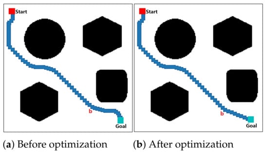 - D* Lite searches reversely from the goal node to the start node for path planning. This strategy is beneficial for replanning in dynamic environments. However, the planned path may have sharp turns [28], which increases the path length and results in a suboptimal path.