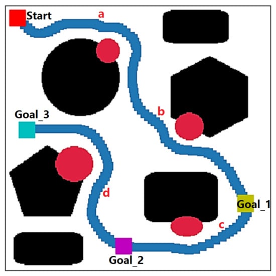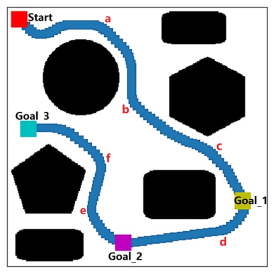 In this section, we improve the D* Lite to support multi-goal path planning and apply it to a static environment. We set one start node and three goal nodes in the static environment. Figure 15 shows the static environment and the planned path.
