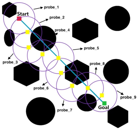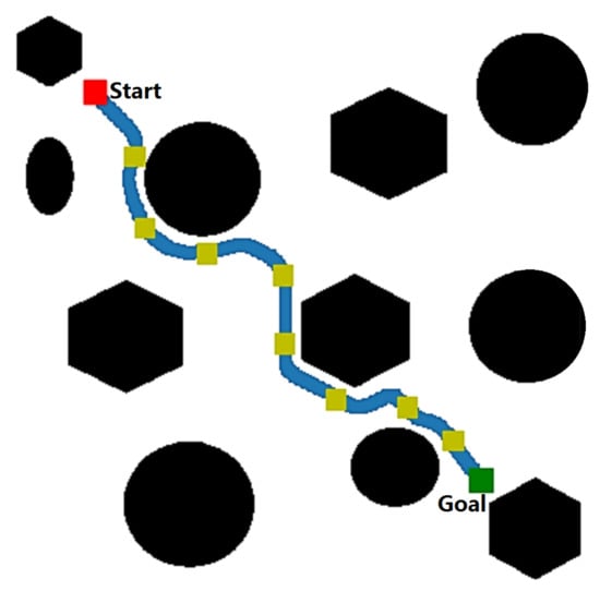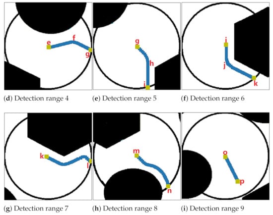 Here, we assume that the sensor’s detection radius is 100 pixels, and the detection angle is 360 degrees. Path planning is performed from a start node to a goal node in an unknown environment. The detection range and local path planning are shown in Figure 17.