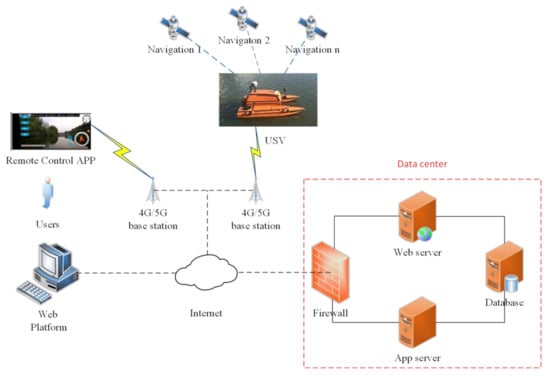 The communication architecture of the USV is shown in Figure 21. To create real-time communication connection between the USV and the remote-controlled app, a communication application is developed and deployed on an app server within a data center. All control commands can be transferred from the Android app to the USV in real time via the 4G/5G network and the communication application. All water quality and USV status data, such as GPS position, velocity and heading, are also transferred from the USV to the data center and the remote app via the communication application. In addition, users also can access the water quality data through a web platform deployed in the data center.