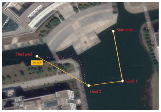 The USV is tested in a small lake of approximately 104 × 140 square meters. We manually plan a path with four special goals for the USV on the Google Earth shown in Figure 22. The safe distance constant is set to 2 m, which means that the USV should keep at least 2 m away from obstacles during the autonomous navigation. In addition, we adjust the output power of the two propellers and set the USV’s velocity to 1 m/s.