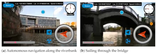 We set the start waypoint at the north riverbank of the lake. There are steps down the north riverbank that allow us to launch the USV. We set the second waypoint () in the middle of the lake and the third waypoint () at the side of the west riverbank. From Figure 22, we find that there are no obstacles along the straight lines between the first three waypoints. Finally, we set the final waypoint at the northwest of the lake, resulting in a 220.52 m navigation path. There is a long riverbank composed of stones between the third waypoint () and the final waypoint. The USV must avoid this huge obstacle (riverbank) and keep a safe distance to the riverbank during the navigation. In addition, there is a bridge across the river. The USV must pass through the bridge before it can reach the final waypoint. The purple dots in Figure 22 represent the actual path that the USV sails. We find that the USV moves along the riverbank with a safe distance. During the navigation, the live video is transferred from the camera on the USV to the app. Figure 23a shows a picture on the app that illustrates that the USV is moving along the west riverbank of the lake. Figure 23b shows that the USV is passing through the bridge to reach the final waypoint of the planned path. The USV’s GPS positions, speed and heading are all shown on the app. Users can also adjust the velocity by moving the slider on the bottom left of the screen. Furthermore, users can manually control the heading of the USV by changing the direction of the red arrow in the white circle. The Supplementary Videos (Video S2) show the entire procedure.