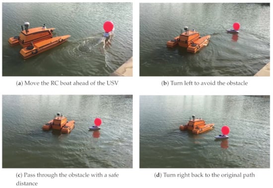 In this experiment, we bind a red balloon on a remote-controlled (RC) boat to simulate a dynamic obstacle. We plan a simple path with a straight line. When the USV is autonomously navigating according to the planned path, we remotely control the RC boat to move ahead to the USV (Figure 24a). The Lidar in the front of the USV detects the moving RC boat and a new path is planned immediately between its current position and the goal position. The USV turns the left according to the new path to avoid the RC boat (Figure 24b). Affected by the safe distance, the USV passes through the RC boat with a safe distance (Figure 24c). Finally, the USV turns right, returning to its original path (Figure 24d), and continues its autonomous navigation. The Supplementary Videos (Video S1) show the entire procedure.