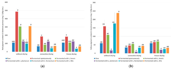 Pigment content in tested fermented beetroot pomace (a) Red pigment (betanin) content in beetroot pomace; (b) Yellow pigment content in fermented beetroot pomace. A, B…—different indexes for individual series mean statistically significant differences for given values at the level of p < 0.05.