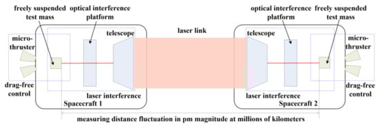 As depicted in Figure 1, the Taiji program was designed to launch three spacecrafts located on the summits of a triangle, whose center orbits around the sun, following the earth at a distance of 3 × 106 km. The triangle forms three arms of the laser interferometer. The detection principle is shown in Figure 2. The working principles for the three triangle arms are basically the same; thus, a single arm between two spacecrafts is used as an example for explanation. Distance fluctuations between two freely suspended test masses are measured by laser interferometry. With the distance fluctuations, gravitational waves can be retrieved. With the three arms, the direction and distance to the gravitational wave sources can be measured [26,27]. As a key technology in the detection, laser interference is vital to the system. To validate this technology and mitigate its technical risks, a semi-physical simulation test was carried out and is discussed in this paper.