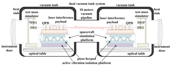For inter-satellite laser interference in the Taiji mission, the technologies used in the three triangle arms are basically the same. Additionally, after the establishment of a laser link for one arm, the other two are easy. As such, in order to verify the technologies and mitigate the risks of the Taiji program, a semi-physical simulation experimental platform was designed for two spacecrafts. Testing of the above-mentioned specifications is performed at the current step. Most of the key inter-satellite laser interference technologies for the triple set can also be verified. As depicted in Figure 3, two spacecraft simulation platforms with the ability for micro-vibration and high-resolution attitude adjustments are used to bear the laser interference payloads. Each spacecraft simulation platform is made up of a precision active vibration isolation platform and a piezo-driven hexapod. With the latter placed on the former, the two abilities mentioned above can be realized. The dual-spacecraft simulation platforms are placed between two freely suspended test mass simulators. The semi-physical simulation test for inter-satellite laser interference is carried out in a dual vacuum tank system. The dual vacuum tank system, which is composed of two vacuum tanks with a heat sink and a vacuum pipeline, is used to simulate the cosmic vacuum and cold-black environment where the two spacecrafts are located. With the QPDs (quadrant photodiodes) located on the laser interference payloads, both the pointing jitter of 100 nrad/√Hz and ranging noise of 100 pm/√Hz can be tested.
