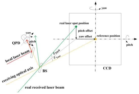 As depicted in Figure 4, the receiving optical axis passes through not only the reference position of the CCD, but also the center of the QPD. The received laser beam (green line) emitted by the remote spacecraft is first acquired by the CCD. The specification for the residual error for the acquisition phase based on the CCD is 1 μrad. With an FOV of 1.5 μrad, the received laser beam can be detected by the QPD. Due to the Doppler shift originating from the relative motion between spacecrafts, heterodyne interferometry is adopted; thus, the received laser beam interferes with the local laser beam, which is projected onto the center of the QPD. Then, the beat signal phase is calculated using DWS technology [41]. The two-dimensional angle of the pitch and yaw between the received laser beam and the local laser beam (also the receiving optical axis) is measured. Based on the measurement accuracy to the order of 1 nrad/√Hz, the pointing jitter can be suppressed to 100 nrad/√Hz; thus, precise pointing of laser is achieved. The DWS angle measurement is achieved using an SCI (science interferometer), which will be demonstrated in Section 3.2. The local laser beam will also bedepicted, expressed as LASER1.