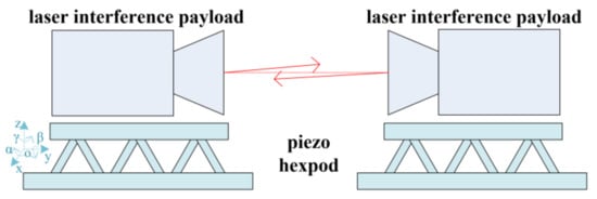 The technical solution for the semi-physical simulation test for the establishment of inter-satellite laser links is shown in Figure 6. The SCI is applied to achieve high-precision angle measurements using DWS technology. The piezo-driven hexapod is used to simulate high-resolution attitude adjustments for the spacecrafts. With the combination of DWS technology and piezo-driven hexapods, not only can the residual error of 1 μrad for the acquisition procedure based on the CCD be verified, but the pointing jitter of 100 nrad/√Hz for the establishment of the inter-satellite laser link can also be tested.