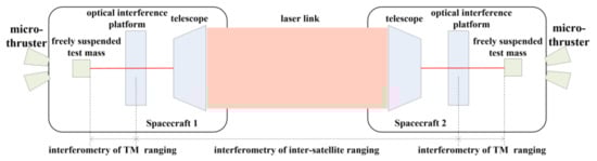 As mentioned earlier, distance fluctuations caused by gravitational waves between two freely suspended test masses, which are located in adjacent spacecrafts, are measured using laser interferometry. As shown in Figure 7, the optical interference platform is mounted on the spacecraft. Although space is a microgravity environment, tiny vibrations still exist on the spacecraft. Inside the spacecraft, vibrations are treated as common mode noise, which can be suppressed [29]. For the interferometry of inter-satellite ranging, vibrations are treated as differential mode noise, which cannot be eliminated; therefore, two freely suspended test masses are adopted as displacement reference benchmarks for the interferometry of space gravitational waves. The optical measurement process for distance fluctuations between two test masses is divided into three segments. One segment involves the interferometry of inter-satellite ranging between two optical interference platforms located in adjacent spacecrafts, while the other two segments involve the interferometry of TM (test mass) ranging between the optical interference platform and TM in each spacecraft.