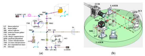 The optical path design for the single-interference platform is depicted in Figure 8a. LASER1 (red line) is split into three parts by BS1 (beam splitter 1) and BS2. Two parts involve local laser beam 1, the first part of which is directly projected onto the center of the QPDs after splitting by BS3 of SCI. The second part is first transmitted to the TM. Both LPs (linear polarizers) and ¼λ wave plates are used to alter the polarization state of the laser. After passing through a ¼λ wave plate twice, the transmission direction of the laser through PBSs (polarized beam splitters) is changed. The laser beam (blue line) is reflected by the TM, MR2 (mirror reflector), and PBS2 in turn. Then, it is projected onto the center of the QPDs after splitting by BS4 of the TMI (test mass interferometer). The third part, which is split by BS2, is emitted out. LASER2 (pink line) is local laser beam 2 on the same platform. It is only projected onto the center of the TMI’s QPDs.