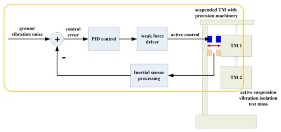 A schematic diagram and block diagram of the multi-stage suspension vibration isolation based on active control are shown in Figure 9. A two-stage suspension is used. An active control system, which is achieved by utilizing technologies such as an inertial sensor, PID control, weak force driver, and precision machinery, is imported on TM 1. The control period for the active control is far less than the period for the ground vibration; thus, the ground vibration noise is isolated by the active control acting on TM 1 before it is transmitted to TM 2 and suspended at the second stage. As such, TM 2 can move freely in the horizontal direction. Through reasonable design of the suspension system and active control system, the displacement disturbance of TM2 in the low millihertz frequency band can be ensured to be in the order of the pm magnitude, so as to perform the semi-physical simulation of the freely suspended test mass. This challenging task is currently being tackled by another participating team from the Taiji program.