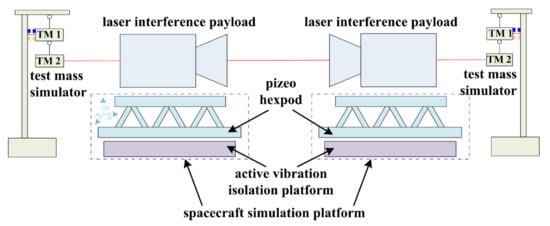The technical solution to the semi-physical simulation test for the interferometry of inter-satellite ranging is shown in Figure 10. Two test mass simulators, which are based on active suspension vibration isolation technology, are used to simulate the two freely suspended test masses in adjacent spacecrafts. The spacecraft simulation platforms, with the ability for both micro-vibration and high-resolution attitude adjustments, are used to simulate the spacecraft. The dual-spacecraft simulation platforms are placed between the two test mass simulators. Ranging noise of better than 100 pm/√Hz can be expected for the interferometry of inter-satellite ranging, which can be tested by measuring the system noise.