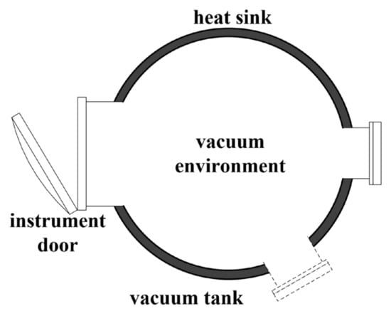 An oil-free vacuum tank with a heat sink, as shown in Figure 11, is adopted to simulate the cosmic vacuum and cold-black environment. The inner wall of the vacuum tank is blackened, with the heat sink surrounding the outside. The heat sink is filled with liquid nitrogen to obtain a uniform low temperature, which is used to simulate the cold-black space environment. The main technical parameters of the vacuum tank are listed in Table 6, which at a highly technical level can be achieved in the laboratory [55,56].