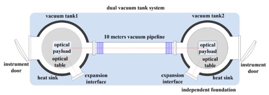 For the inter-satellite laser interference, simulation is required of the cosmic vacuum and cold-black environment where the two spacecrafts are located; therefore, the dual vacuum tank system shown in Figure 12 is used for the simulation. The dual vacuum tank system is composed of two vacuum tanks with a heat sink and a vacuum pipeline, the length of which is 10 m and which connect the two tanks. The inner diameter of the pipeline is 1 m, so as to ensure enough room to complete the laser acquisition reciprocally when establishing the inter-satellite laser link. An optical table is designed for each vacuum tank to carry the spacecraft simulation platform and the laser interference payload. According to Section 3.2, only ground vibration noise above 0.7 Hz can be isolated by the precision active vibration isolation platform. In order to minimize the impact of ground vibration noise on the laser interferometry, the optical table is also subjected to strict vibration isolation treatment. A two-stage vibration isolation method for the independent foundation plus active vibration isolation is adopted to ensure the vibration acceleration is attenuated to 10−5 g within the frequency range of 0.1~100 Hz.