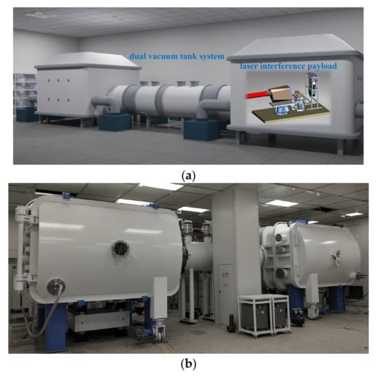 Based on the detailed analyses of the semi-physical simulations described above, an experimental platform for the semi-physical simulation test of the inter-satellite laser interference is designed. The experimental scenario for the semi-physical simulation test of inter-satellite laser interference is shown in Figure 13a. The dual vacuum tank system under construction is depicted in Figure 13b.
