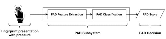 The proposed PAD solution is segmented into two folds (Figure 1): (i) instructed data acquisition: the participants are given sufficient information about the style of performing a presentation by adding pressure while placing the fingertip at the sensor’s surface, and (ii) software mechanism: used in the PAD subsystem to extract discriminative features that classify bona fide and attack presentations. These segments are explained as follows.