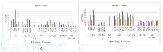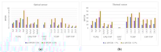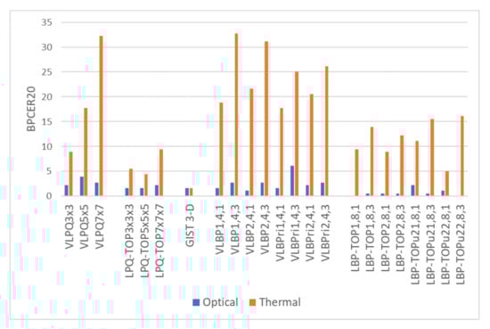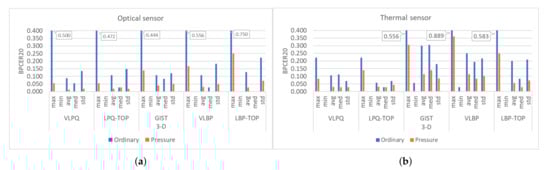 As can be seen from Figure 11, the differences between the max BPCER20 values are remarkable when comparing the pressure and ordinary scenarios. The best improvement is achieved considering VLPQ for the optical sensor, where BPCER20 is reduced from 50% to approximately 5%, i.e., BPCER20 is 10 times less for the pressure scenario. In addition, the average, median, and standard deviation values are reduced for all feature extractors for the pressure scenario. This implies a lower range of disparity at a lower average value for BPCER20.