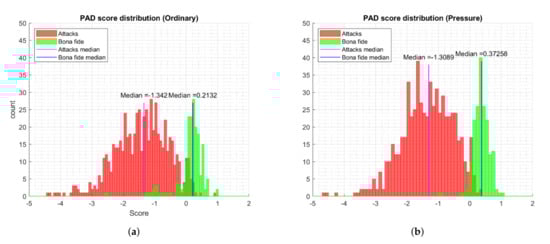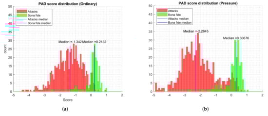 The most intriguing observation to emerge from Figure 8 is the significant accuracy enhancement when using for the optical sensor and for the thermal sensor. Thus, Figure 9 and Figure 10 demonstrate the score distributions for bona fide and attack presentations considering both cases. The influence of pressure can be simply noticed by comparing the median values for attacks, and the median values for bona fide. Considering the optical sensor, the median of attacks dropped from −1.34 to −2.28 and the median of bona fide increased from 0.21 to 0.30. On the other hand, the thermal sensor does not show a noticeable change in the median of attacks but the median of bona fide increased from 0.21 to 0.37. Another interpretation can be seen by the decreased misclassified presentations when pressure is considered.