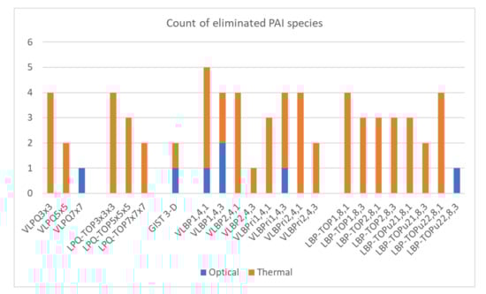 II. The mechanism’s capability of eliminating specific PAI species. The comparison is carried out by determining the number of eliminated PAI species considering the different sensors and feature extractors (Figure 13).