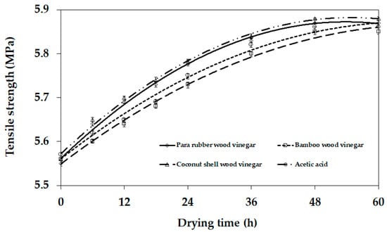 Table 1 presents the chemical and physical properties of the NR sheets which were related to the type of coagulant material. The results of the average dirt and volatile contents of the NR sheets showed that the different types of wood vinegar coagulants were not significantly different from acetic acid. This result was due to acetic acid being the major component of wood vinegars. For the physical properties, Figure 2 shows that the tensile strength at break of the NR sheet samples changed during the drying process. Figure 2 presents that an increase in drying time had the influence of increasing the tensile strength at break for all samples. This result was due to the space between the rubber molecules being decreased after water molecule evaporation [,]. In comparing the tensile strength at break values between each experimental and reference result, it is shown that all the wood vinegar coagulating materials were not significantly different from the acetic acid. The results show that the average percentage of elongation at break and the 300% modulus were not significantly different.