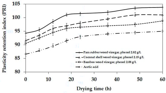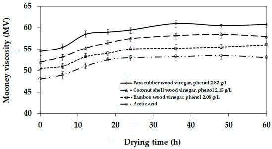 Figure 3 and Figure 4 present the effect of the type of coagulating material on the Mooney viscosity and plasticity retention index for the sheet rubber, respectively. In comparing the phenolic group among the four coagulating materials (para rubber wood vinegar > coconut shell wood vinegar > bamboo wood vinegar > acetic acid), an increasing number of phenolic groups in the NR latex reacted with the amine groups in the rubber [,], which increased the Mooney viscosity and PRI of the NR sheet. Therefore, the phenolic group in the NR latex had a strong influence on the Mooney viscosity and PRI properties of the sheet. This agreed with the results reported in [,]. Note that the results indicated that the concentration of acids influenced the Mooney viscosity, PRI properties, and the manufacturing process more than the acid types.