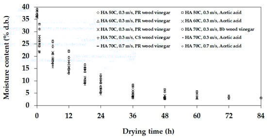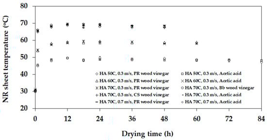 Figure 6 presents the NR sheet moisture change during the drying process for each type of coagulating material, airspeed, and temperature. When the drying process started, the NR sheet moisture rapidly reduced through convection heat transfer over the first 12 h. Afterward, the decrease in moisture of the samples was at a constant rate due to heat diffusion until drying finished at a final moisture of 3.0% d.b. [,]. For this reason, as the drying temperature was increased, the drying time reduced.