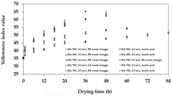 The yellowness kinetics of the NR sheet change during the drying process (HA = hot air, PR = para rubber, Bb = bamboo, and CS = coconut shell).