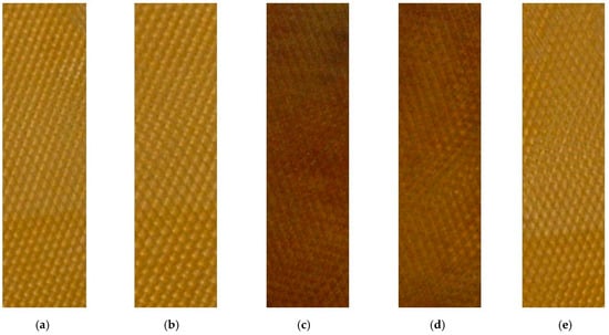 The color of each experimental sheet sample and the referent for (a) para rubber wood vinegar; (b) acetic acid; (c) bamboo wood vinegar; (d) coconut shell wood vinegar; and (e) the referent.